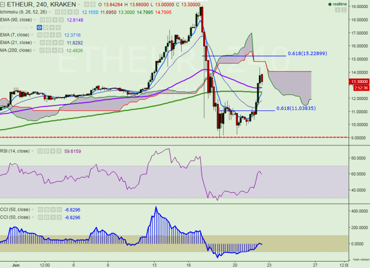 Long-term trend remains to be bullish. In 4-hour chart, ETH/EUR is trading well above Tenken-Sen and Kijun-Sen. So slight jump till 15.23 (61.8% retracement of 19.08 and 9) is possible.