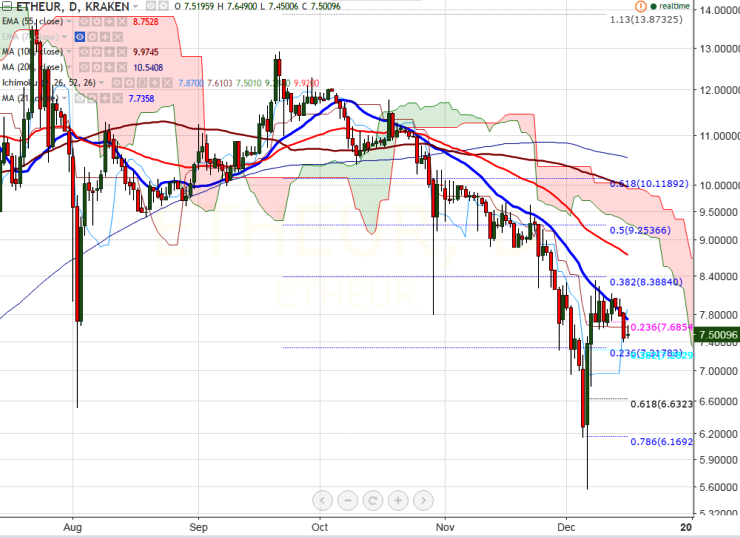 Long-term trend remains to be bearish. ETH/EUR trades slightly below 7.60 (daily Kijun-Sen) and this confirms minor bearishness a decline till 6.65 is possible.