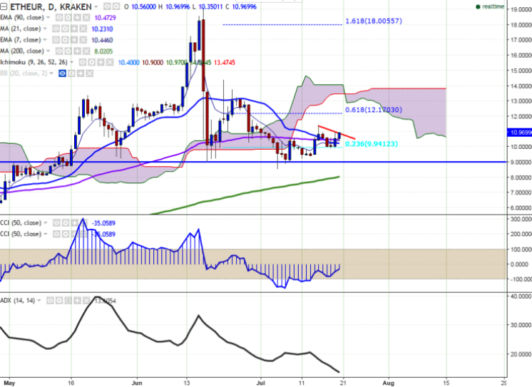 The Long-term and short-term trend remains to be bullish. In daily chart, ETH/EUR is trading well above 21 days MA. So a jump till 11.40 is possible.