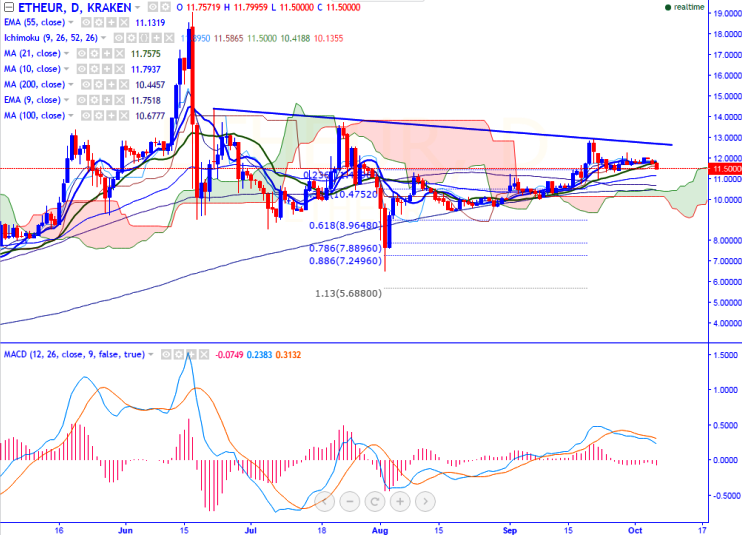 Long-term trend remains to be bullish. ETH/EUR breaks 21- day MA and declined till 11.50 at the time of writing. The pair is trading well below 10- day MA (11.77),21- day MA and Tenkan-Sen and Kijun-Sen.So short term trend is slightly weak, a decline till 11 likely.