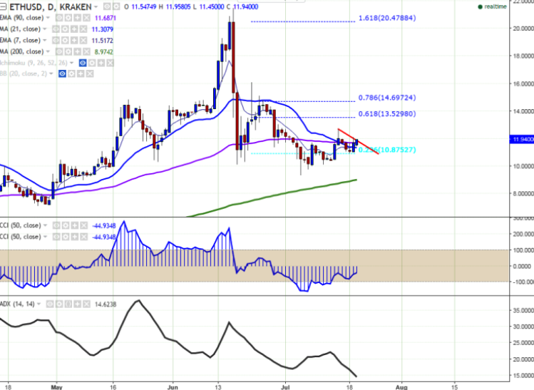 ETH/USD has broken above 90 EMA and currently trades at 11.95 levels at the time of writing (Kraken).