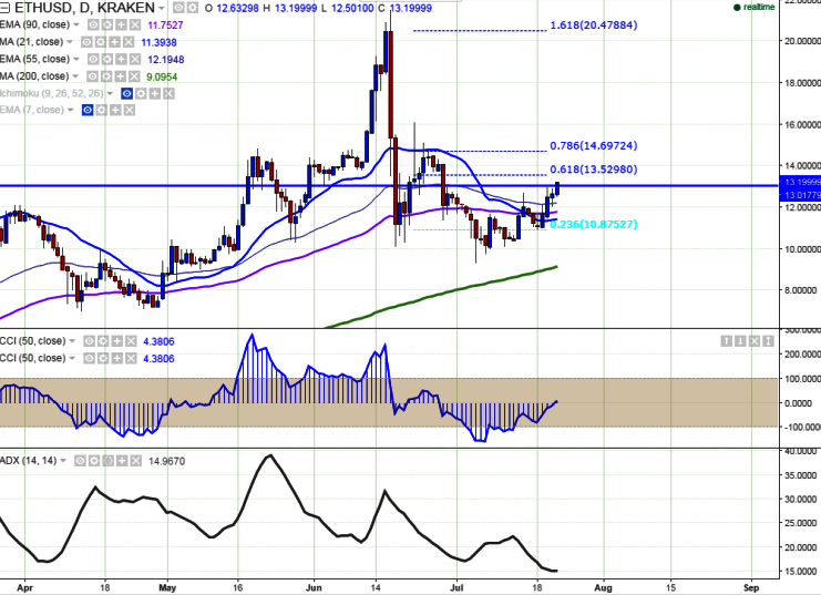 ETH/USD continued its upward trend on Friday on the back of newly found momentum following the hard fork. It has hit a fresh high of 13.18 levels so far in the day, and currently trades at 13.12 levels at the time of writing (Kraken).