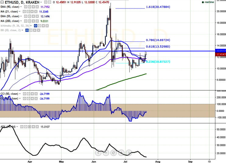 Following the hard fork, ETH/USD hit a high of 13.00 levels on Wednesday. However, it failed to hold its strength and currently trades at 12.34 levels at the time of writing (Kraken).