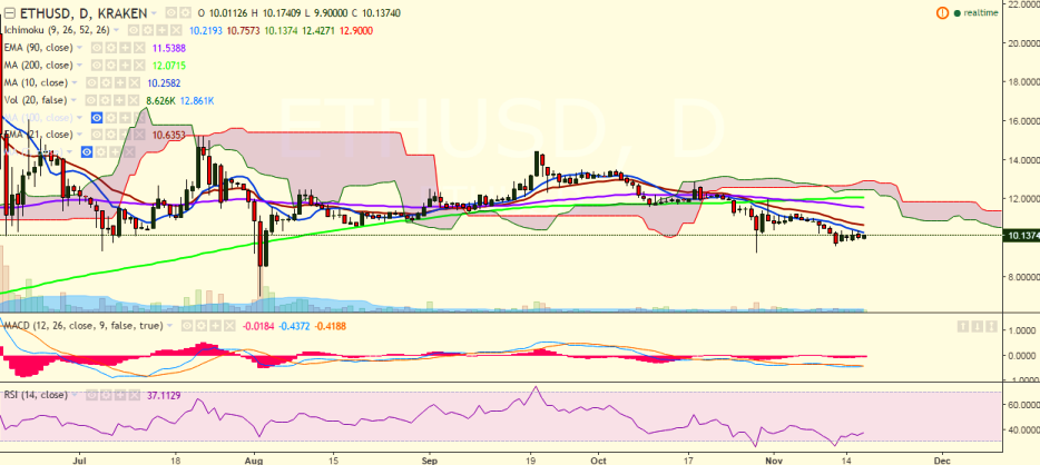 ETH/USD continues to hover around the 10.00 mark and is trading at 10.13 levels at the time of writing (Kraken).