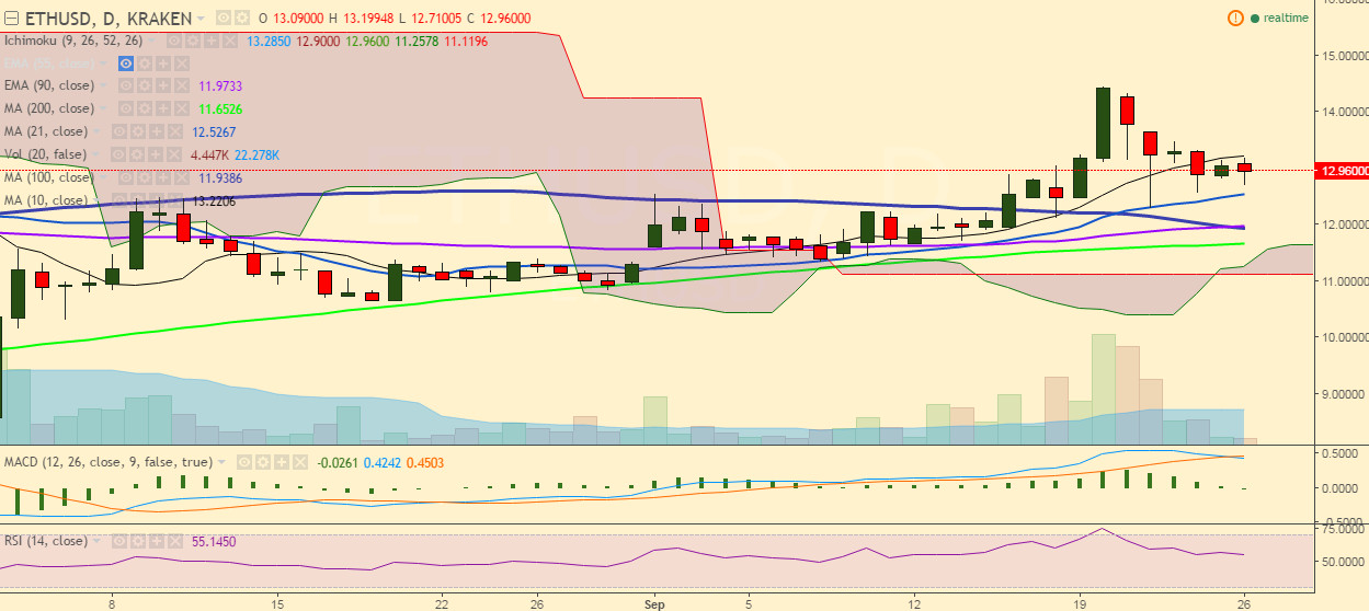 ETH/USD is trading in red on Monday and has hit 12.71 levels before restoring to 12.96 levels, where it currently trades (Kraken).