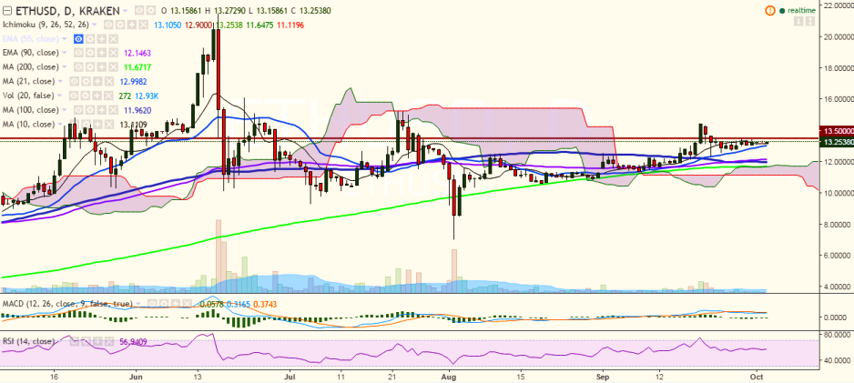 ETH/USD is trading flat after hitting 13.50 levels and has taken support near 10-day MA. It is currently trading at 13.25 levels at the time of writing (Kraken).