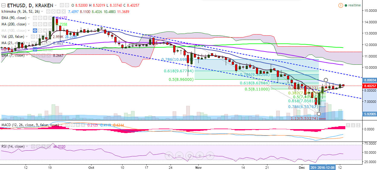 ETH/USD managed to close just above 21-day MA on Monday and continues to hover around this level today. It is currently trading at 8.40 levels(Kraken).