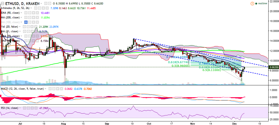 ETH/USD has recovered sharply after hitting the 9-month low of 5.92 levels on December 06. The pair is currently trading at 8.64 levels at the time of writing (Kraken).