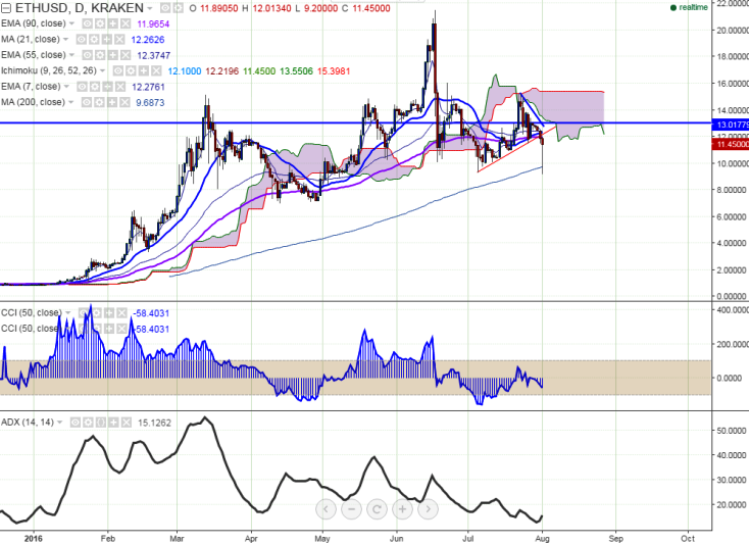 ETH/USD has recovered sharply after making a low of $9.20.It is currently trading around $11.42 (Kraken).