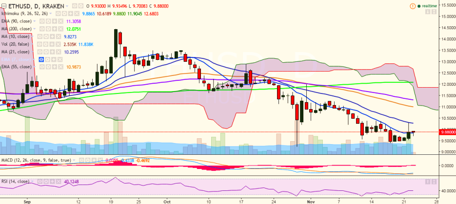 ETH/USD failed to hold its strength above the 10.00 mark and is currently trading at 9.88 levels (Kraken).