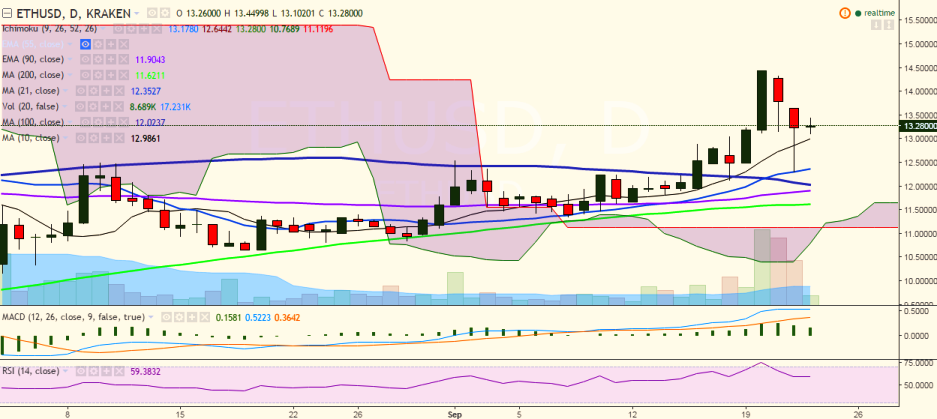 ETH/USD has restored its strength to 13.28 levels on Friday, after hitting a low of 12.30 levels on September 22 (Kraken).