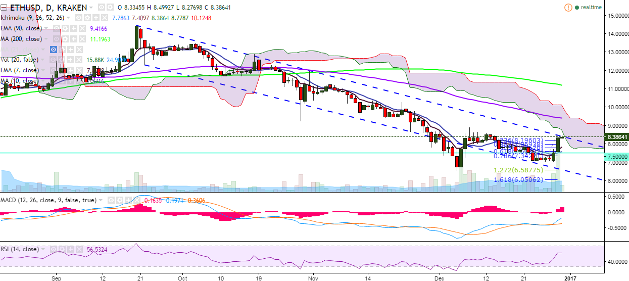 ETH/USD hit a high of 8.56 levels on Thursday and is currently trading at 8.38 levels at the time of writing (Kraken).