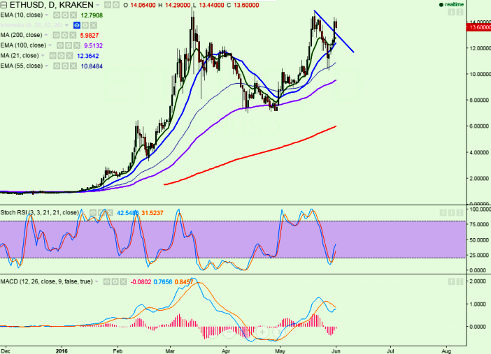 - ETH/USD price spiked higher and broken $14 resistance area .It has reached till $14.39 and started to decline from that level. It is currently trading around $13.64.