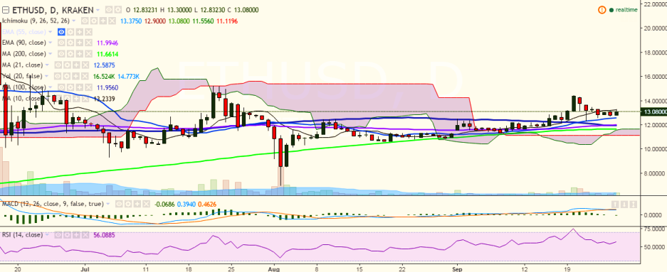 ETH/USD is struggling to break above 10-day MA and is currently trading at 13.08 levels. It has hit a high of 13.30 levels so far in the day (Kraken).
