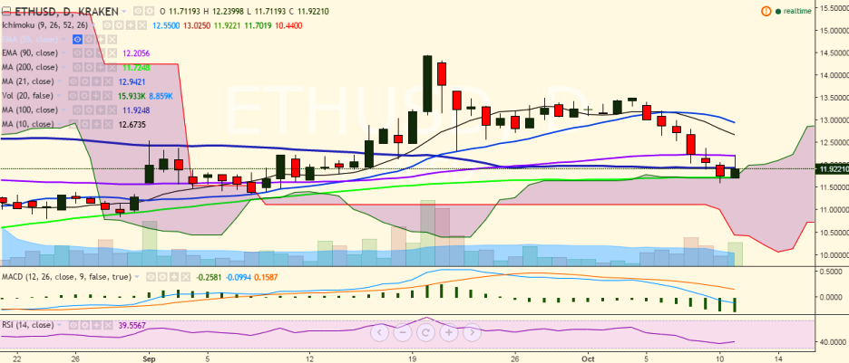 ETH/USD reversed its downtrend after hitting a low of 11.60 levels on Monday. The pair hit 12.23 levels so far in the day and is currently trading at 11.92 levels (Kraken).