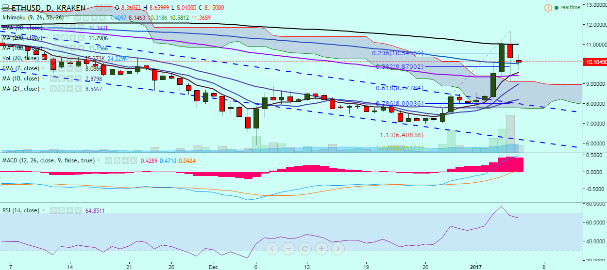 ETH/USD failed to close above 200-day MA on Thursday and is currently trading at 10.14 levels at the time of writing (Kraken).