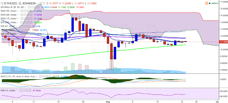 ETH/USD continues to trade flat on Tuesday, sustaining its strength above 11.00 levels. It is currently trading at 11.13 levels at the time of writing (Kraken).