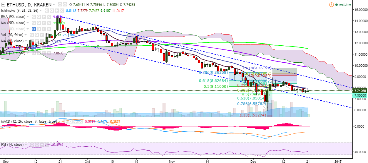 ETH/USD continues to trade in a narrow range, maintaining its strength above the 7.50 mark. It is currently trading at 7.74 levels at the time of writing (Kraken).