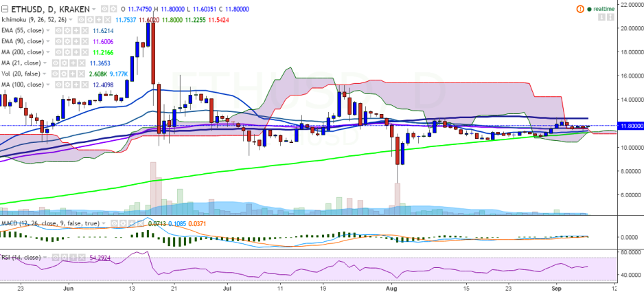 ETH/USD is trading flat on Wednesday and is trading above 90 EMA. It is currently trading at 11.80 levels at the time of writing (Kraken).