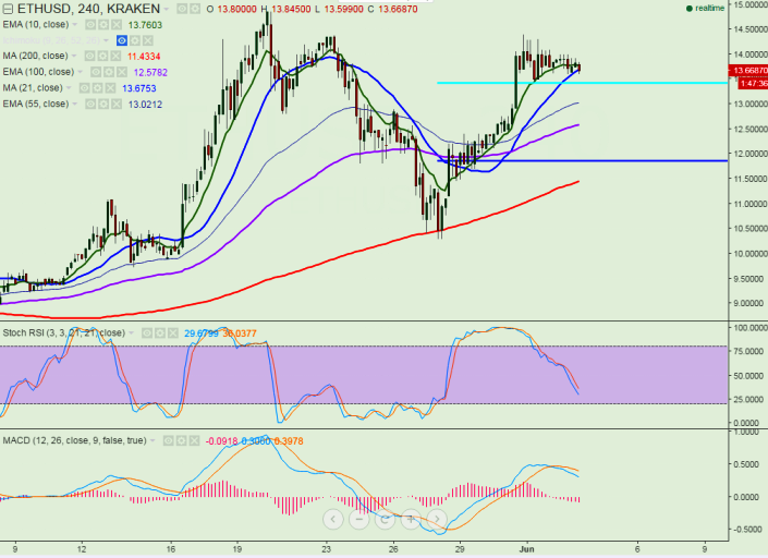 - The pair is facing minor intraday resistance of $14 for the day and any break above will take the ethereum till $14.40/$14.85 in short-term.