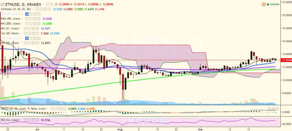 ETH/USD has failed to close above 10-DMA on Wednesday and has declined till 13.08 levels, after hitting a high of 13.47 levels yesterday. It is currently trading at 13.12 levels (Kraken).