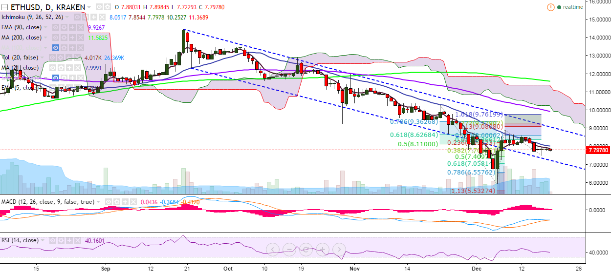 ETH/USD is trading in a narrow range on Monday between 7.72 and 7.89 levels. It is currently trading at 7.76 levels (Kraken).