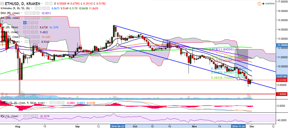 ETH/USD is trading well above 8.00 level on Thursday, with its upside being capped by 38.2% fib retracement. The pair is currently trading at 8.51 levels at the time of writing (Kraken).