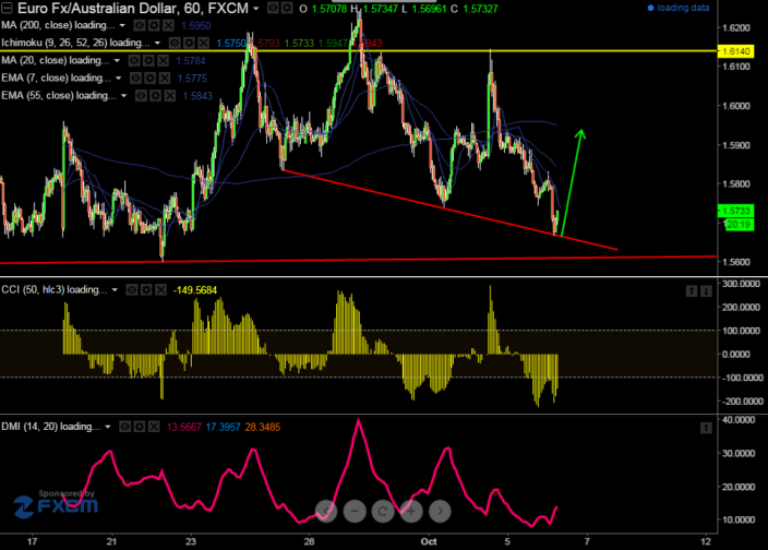 - EUR/AUD has taken trend line support around 1.5666 (trend line joining 1.5832 and 1.5741) and nay break below confirms short term weakness, a decline till 1.5600/1.5580 cannot be ruled out.