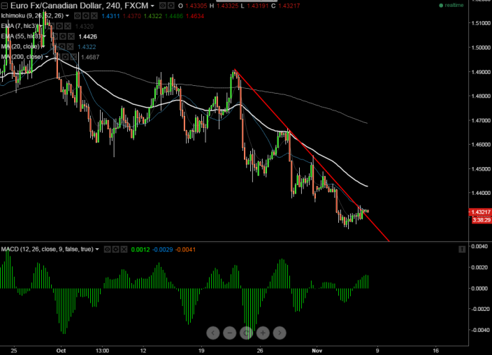 EUR/CAD has made a low of 1.4270 yesterday and started to recover from that level. It is currently trading around 1.4320.