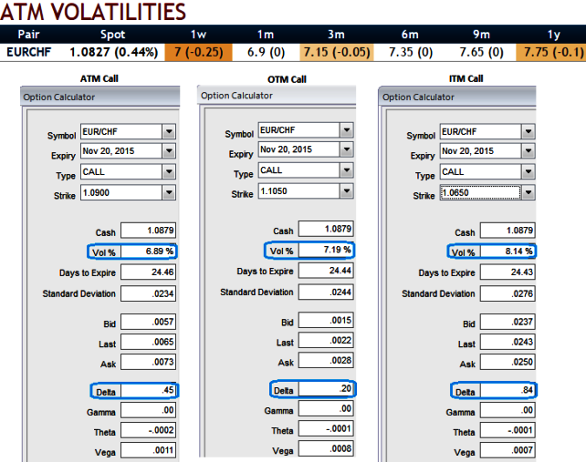 We ponder now with an another call option with the same maturity on the same pair is priced with an implied volatility of 7.15% but its strike is 2% out of the money (strike at 1.1050) and while its delta is just shy of 20%.