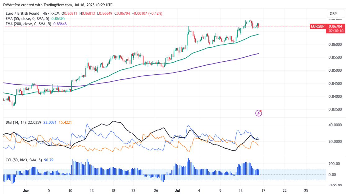 EURGBP showed a minor sell-off after UK CPI. Intraday bias remains bullish as long as support 0.8580 holds. It hits an intraday high of 0.86950 and is currently trading around 0.86710.