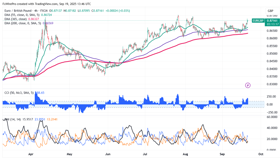 EURGBP holds above 0.8700 despite strong UK retail sales. Intraday bias remains bullish as long as support 0.8600 holds. It hits an intraday high of 0.87287 and is currently trading around 0.87153.