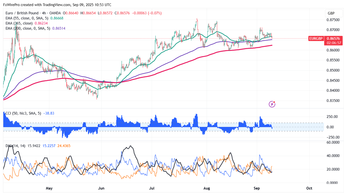 EURGBP trades weak on policy divergence between the BOE and the ECB. Intraday bias remains bearish as long as the resistance at 0.8720 holds. It hits an intraday low of 0.86572 and is currently trading around 0.86580.
