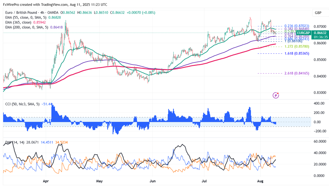 EURGBP trades weak on policy divergence between the BOE and the ECB. Intraday bias remains bearish as long as the resistance at 0.8750 holds. It hits an intraday low of 0.8651 and is currently trading around 0.86618.