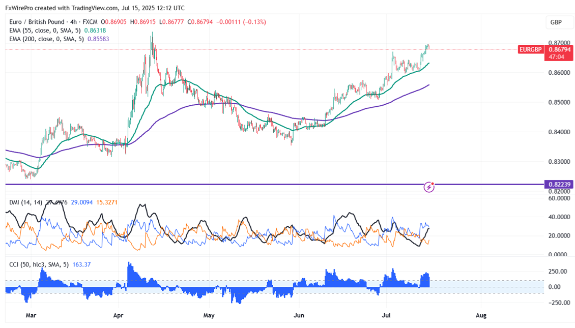 EURGBP jumped sharply on policy divergence between the BOE and ECB. Intraday bias remains bullish as long as support 0.8580 holds. It hits an intraday high of 0.8646 and is currently trading around 0.86802.