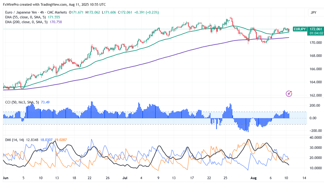 The EUR/JPY pair is trading above the 55 EMA, 200 EMA, and 365-H EMA on the 4-hour chart.