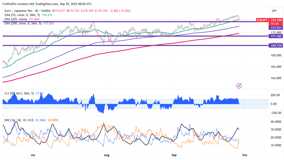 EURJPY showed a minor sell-off after forming a temporary top around 175.05 due to yen strength. It hits an intraday low of 174.20 and is currently trading at approximately 174.211. Intraday outlook remains bullish as long as support 173 holds.