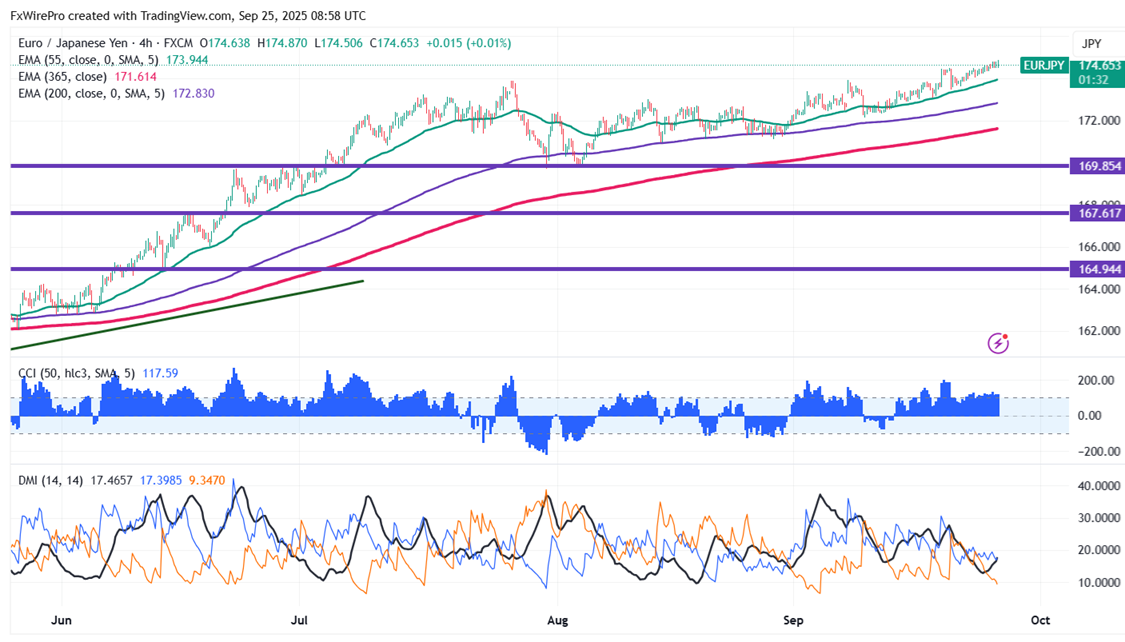 EURJPY trades flat with positive bias. It hits an intraday high of 174.87 and is currently trading at approximately 174.549. The intraday outlook remains bullish as long as support at 173.78 holds.