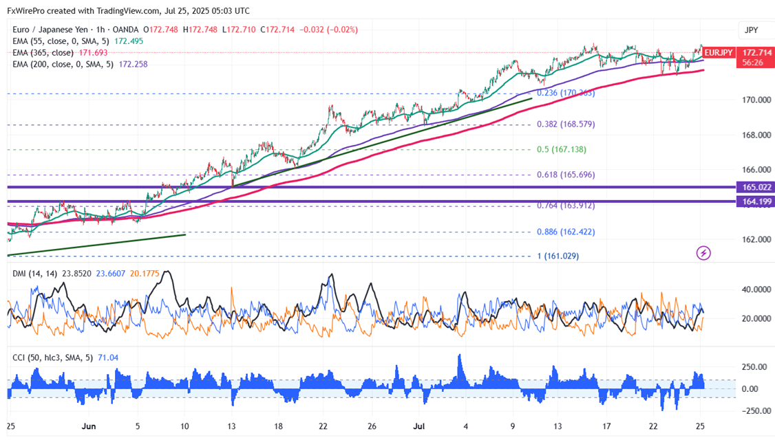 The EUR/JPY pair is trading above 55 EMA, above 200 and 365-H EMA on the 1-hour chart.