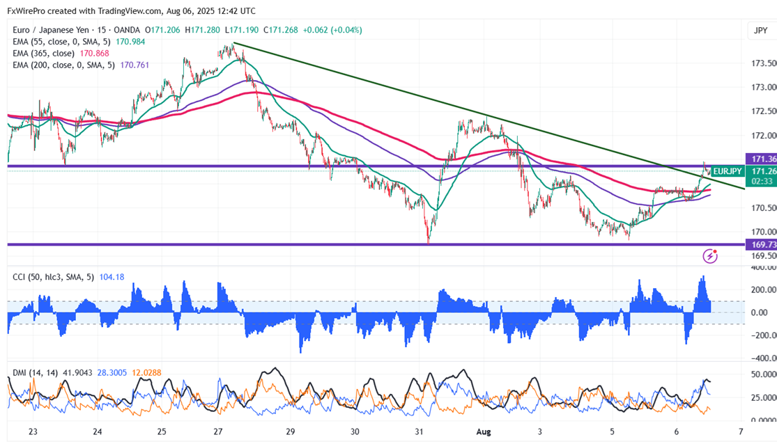 EURJPY has formed a double bottom around 169.70-80 and showed a minor pullback on a strong Euro. It hits an intraday high of 171.46 and is currently trading at approximately 171.21. Intraday outlook remains bullish as long as support 169.80 holds.