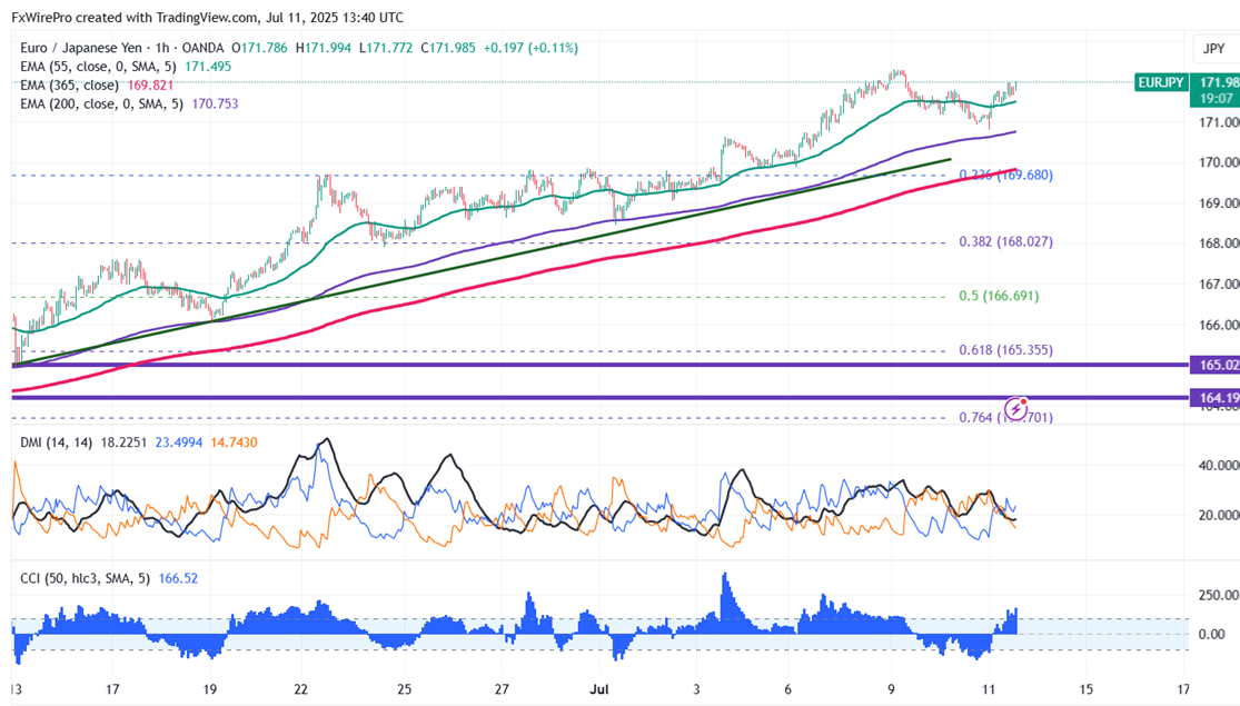 The EUR/JPY pair is trading above 55 EMA, 200, and 365-H EMA on the 1-hour chart.