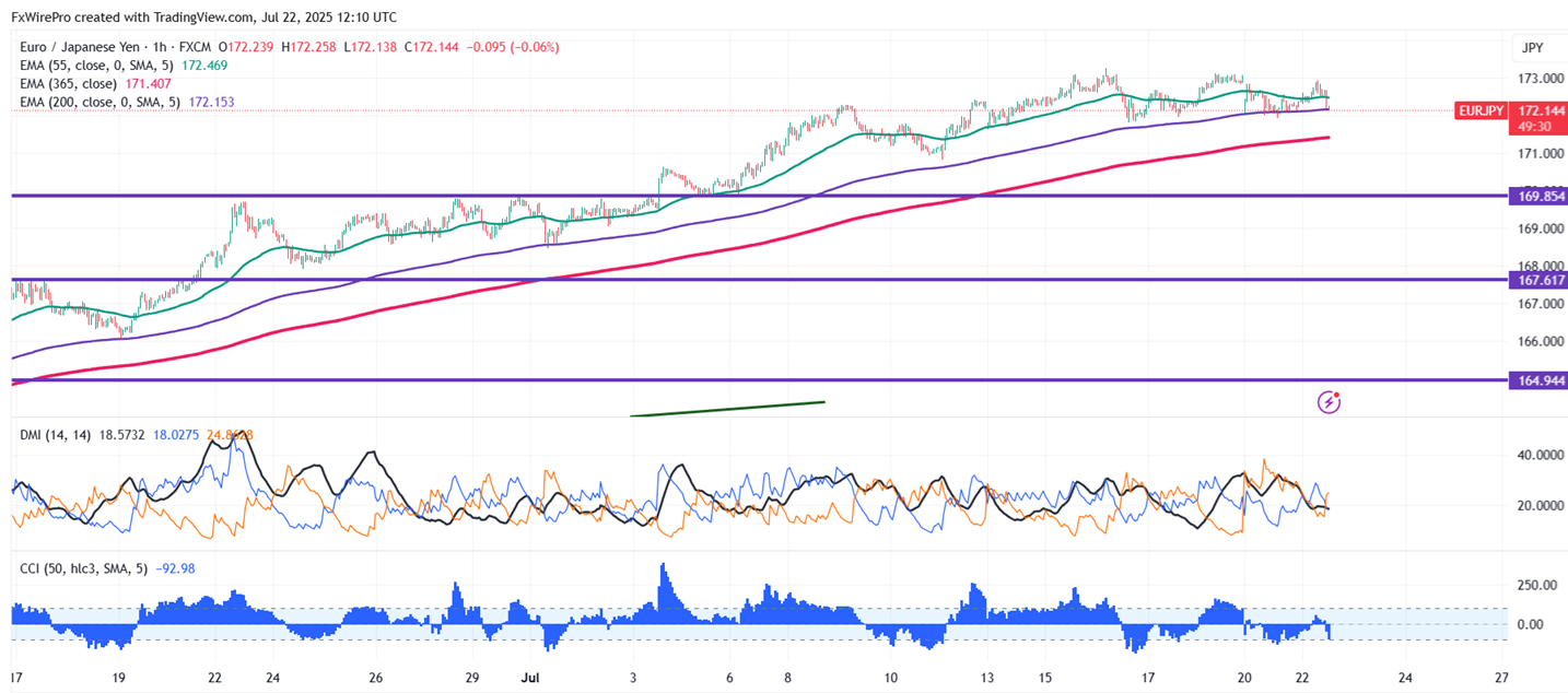 The EUR/JPY pair is trading below 55 EMA, above 200 and 365-H EMA on the 1-hour chart.