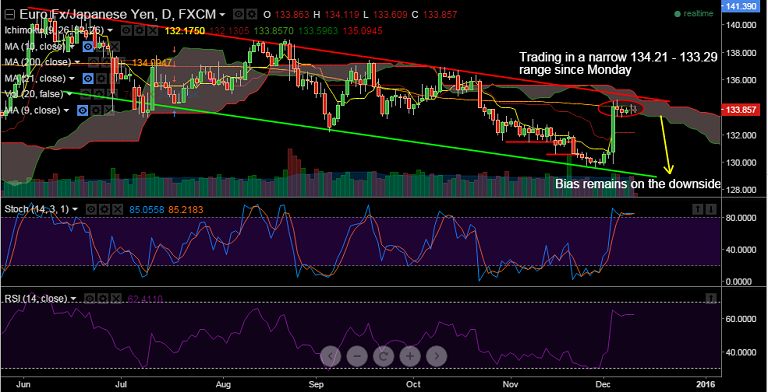 EUR/JPY gains post ECB last week was halted by the daily cloud, we see scope for a drop back to around 132.10 levels.