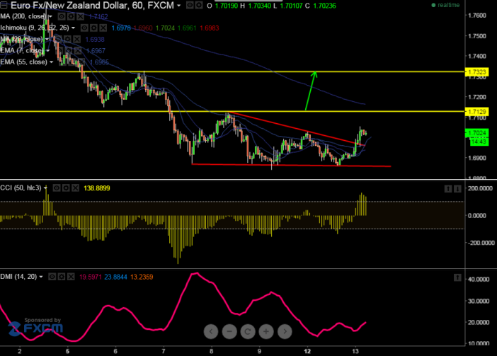 - EUR/NZD has broken major trend line resistance 1.6980 (trend line joining 1.71216 and 1.70289) and this confirms short term bullishness, a jump till 1.7150/1.7308.