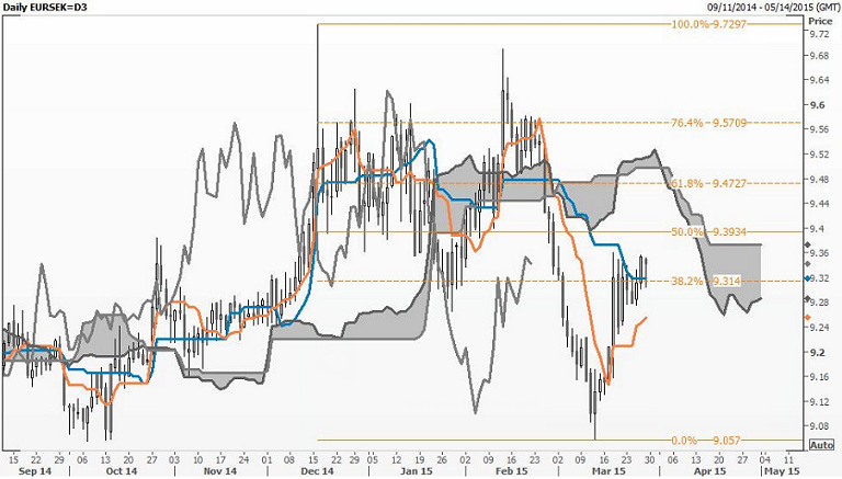 Source: Thomson Reuters EUR/SEK has scope for gains to the 9.3934 level 9.3934 - 50% retrace of the 9.7297 to 9.0570 Dec/Mar fall Daily close above the kijun line at 9.3185 on Thurs supports upside bias
