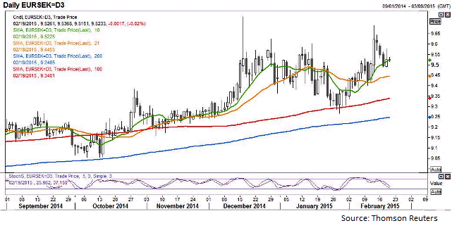 Pair's offers to Wed 9.5760 highs but bids moves in, 9.5150-5250 200HMA supports at 9.5170 and minor resistance is at 9.5560 Currency intervention remains a tool in the central bank's arsenal, Jansson