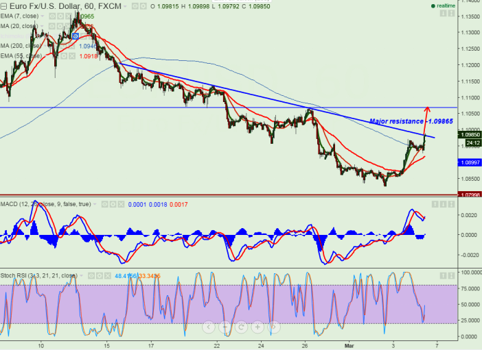 - Major Resistance - 1.09865 (trend line joining 1.11930 and 1.11737)