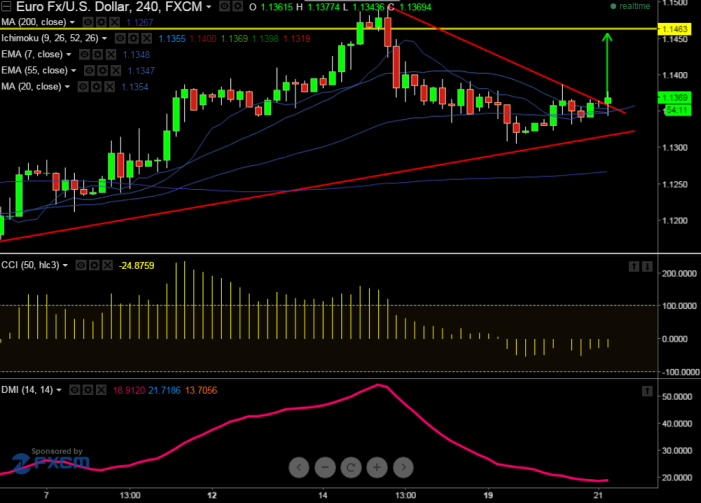 EUR/USD breaks minor trend line resistance 1.1360 (trend line joining 1.14940 and 1.13868) and this confirms minor bullishness, a jump till 1.1420/1.1460 is possible .