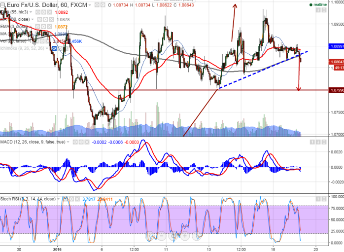 - The pair has broken minor trend line support around 1.0875 which confirms minor weakness , decline till 1.0800 is possible .