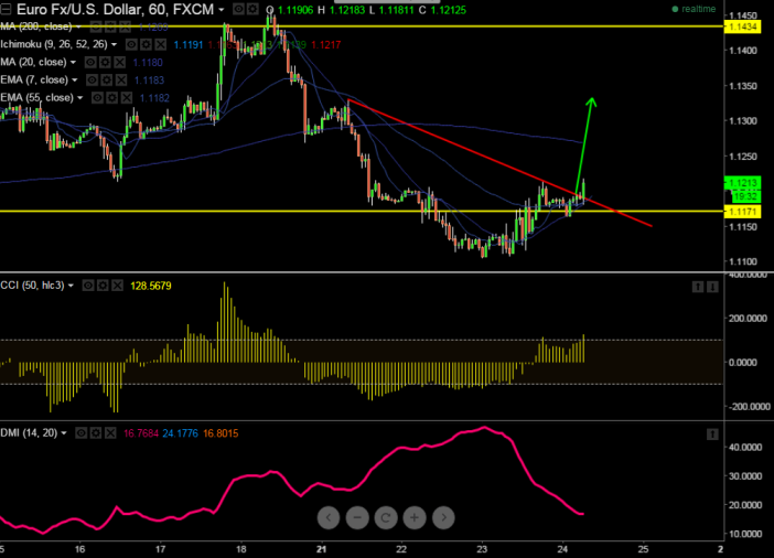 EUR/USD has broken trend line resistance (trend line joining 1.13288 and 1.12132) and this confirms intraday bullishness, a jump till 1.1320 cannot be ruled out .